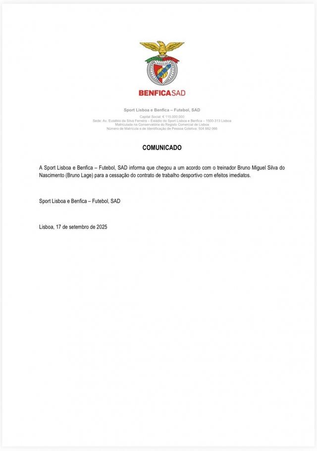 本菲卡足球俱乐部宣布已与主教练布鲁诺-拉格达成协议,解雇立即生效。
